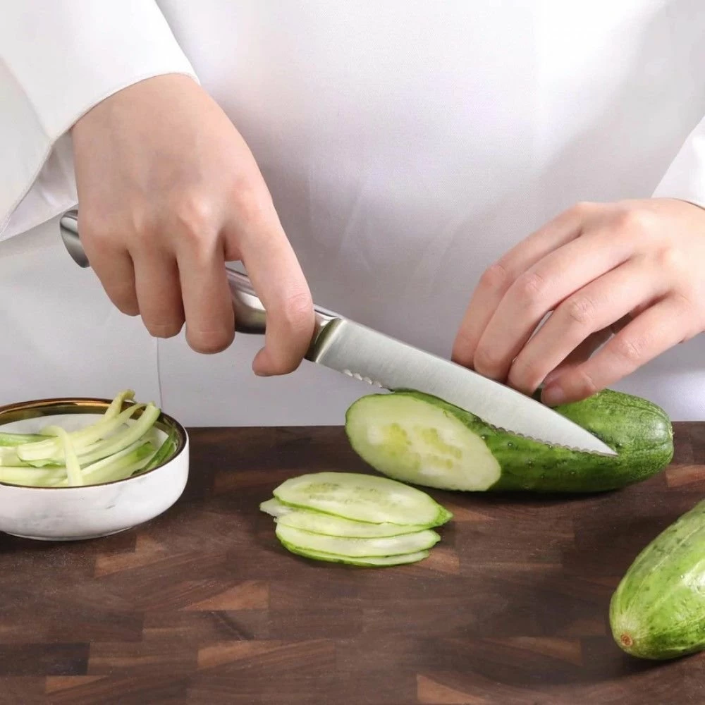 Equip your kitchen for all your essential slicing, dicing and chopping tasks with the Sanford Series 6-Piece Knife Set from Cangshan Cutlery. This set includes five knives and one pair of shears, which come apart for easy cleaning. Every knife from Cangshan is hand-crafted and hand-sharpened by skilled artisans, ensuring the highest quality in every blade. Made of high alloy German steel, these blades are durable and stain-resistant with long-lasting edge retention. The razor sharp 16° edges allow for effective cutting, while the angled bolster and well-balanced ergonomic handles provide a natural and secure grip. With a stainless matte finish and strong, sleek design, these knives make a sophisticated and powerful statement. Completing the set are 6 fitted plastic sheathes for safely storing your knives and protecting the blades while not in use. For knives that impart efficiency and style to your meal prep routine, order your Cangshan Cutlery Sanford Series 6-Piece Knife Set today.