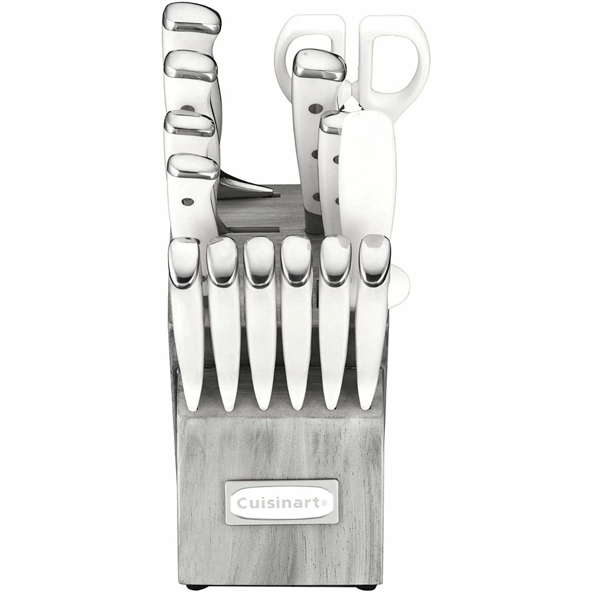 When it comes to exceptional performance and affordability, consider the Cuisinart 15-piece Triple Rivet Cutlery Block Set as your choice knife set for all your meal preparation! Each forged blade is made from high-carbon stainless steel that tapers into a slender, ultra-sharp edge for precision and accuracy. The blades are break-resistant, chip-resistant, and rust-resistant. Complete with triple-riveted full-tang construction with wide bolsters for safety, these blades are complete with white ABS-composite handles that are ergonomic, providing balance and comfort in the grip of your hand. This 15-Piece Knife Set includes an 8″ Chef’s Knife, 8″ Slicing Knife, 7″ Santoku Knife, 5.5″ Serrated Utility Knife, 3.5″ Paring Knife, 2.75″ Bird’s Beak Paring Knife, six 4.5″ Steak Knives, 8″ Sharpening Steel, All-Purpose Household Shears, and the grey wooden knife block. This whole set allows you to do essential food prep from slicing/dicing/chopping meats and veggies to more detailed work with stripping and mincing herbs. When you are done using any of the knives in this set, Cuisinart recommends you hand wash them for the utmost maintenance. Don’t be without a quality knife set that doesn’t cost a fortune—order the Cuisinart 15-piece Triple Rivet Cutlery Block Set today!