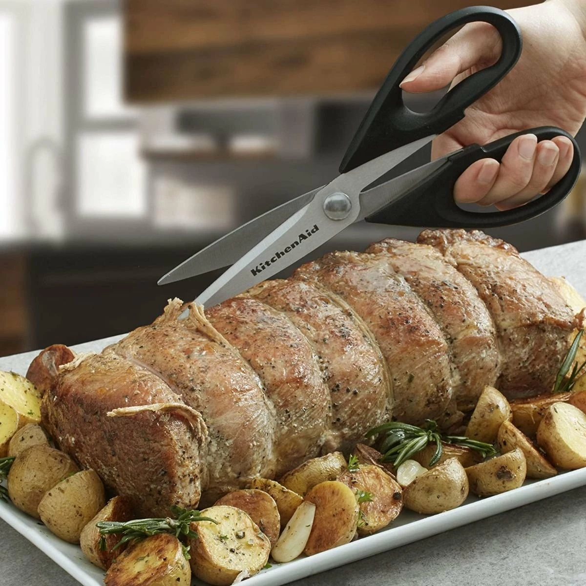 Kitchen shears are an essential part of any cutlery collection, so you need a set you can depend on like the KitchenAid Universal Utility Shears in black. Made from stainless steel, the blades of these kitchen shears are designed with micro-serrations so they cut more cleanly and easily than traditional straight-blades. The scissor blades are also thicker, making them stronger and more durable, so you can cut through poultry with less effort! To make these shears even easier to use, they feature a comfort-grip handle and are easy to use in the right or left hand. To make storing these shears safe, they come with a plastic guard, so you can both protect the blades and your fingers! Make breaking down poultry and opening packages easier, get the KitchenAid Universal Black Utility Shears today!