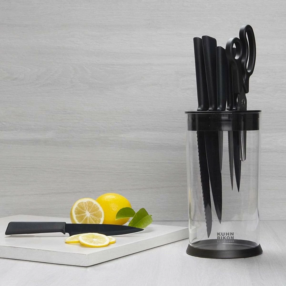 Know exactly which knife you’re grabbing each time with the see-through Vision Knife Stand from Kuhn Rikon! The flexible grid inlay accommodates up to 18 knives of various sizes with blades up 8”. Both the top and bottom of the knife stand are removable for easy access and cleaning, while anti-slip rubber feet keep the stand in place on your countertop.