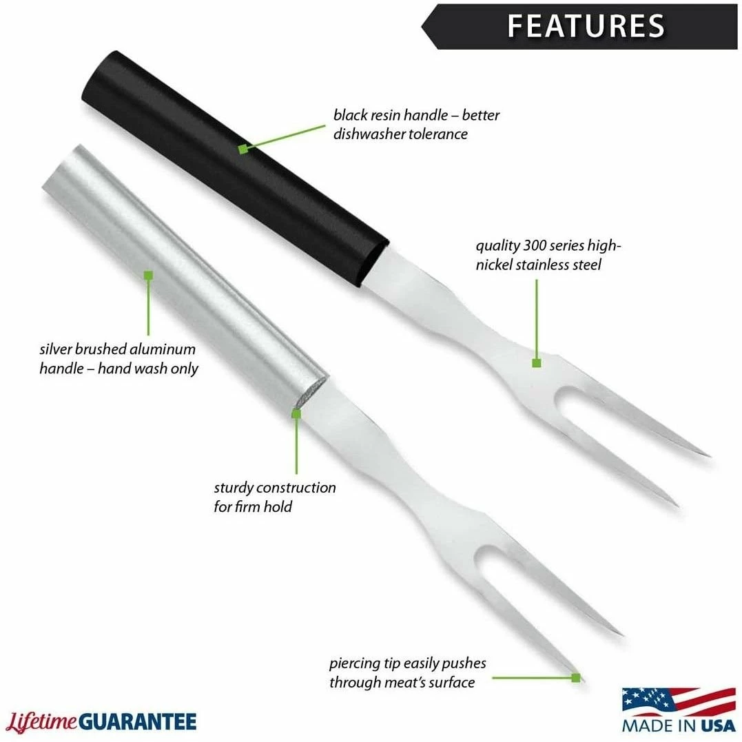 The 9.5″ Carving Fork is designed to be used for carving and lifting cooked meats, providing a secure grasp. The versatility of this fork allows users to turn meat while grilling or frying on the stove, hold it in place while carving, and lift the meat for serving. The sharp, piercing tips of Rada’s Carving Fork easily push through the meat’s surface. High quality and super durable, this fork is a true winner.