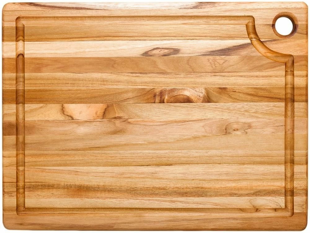 This TeakHaus carving board is constructed from plantation grown, first quality teakwood. Teak has been used for centuries by ship builders due to its strength, durability, and waterproof qualities. This TeakHaus carving board is assembled using individual narrow teak strips for a strong and adhesive bond.
