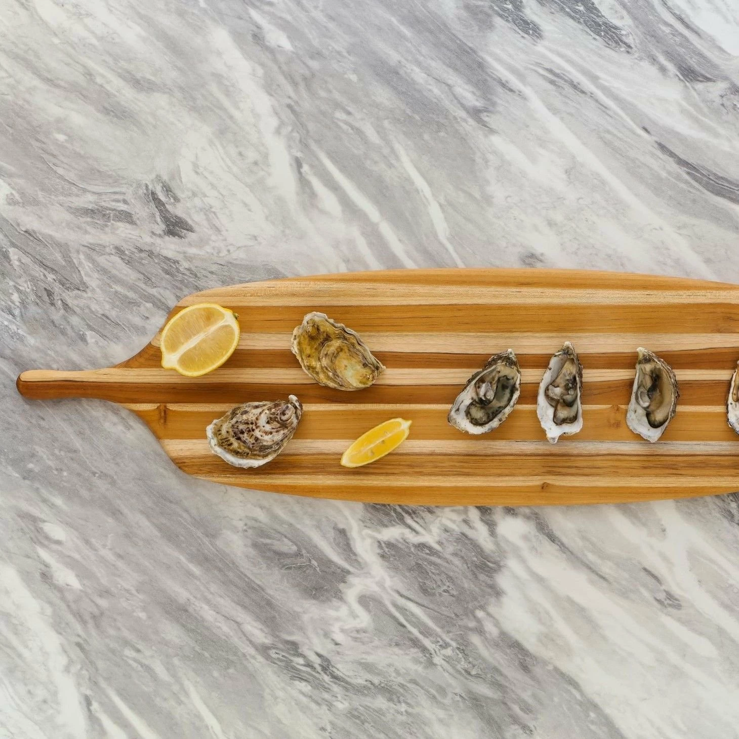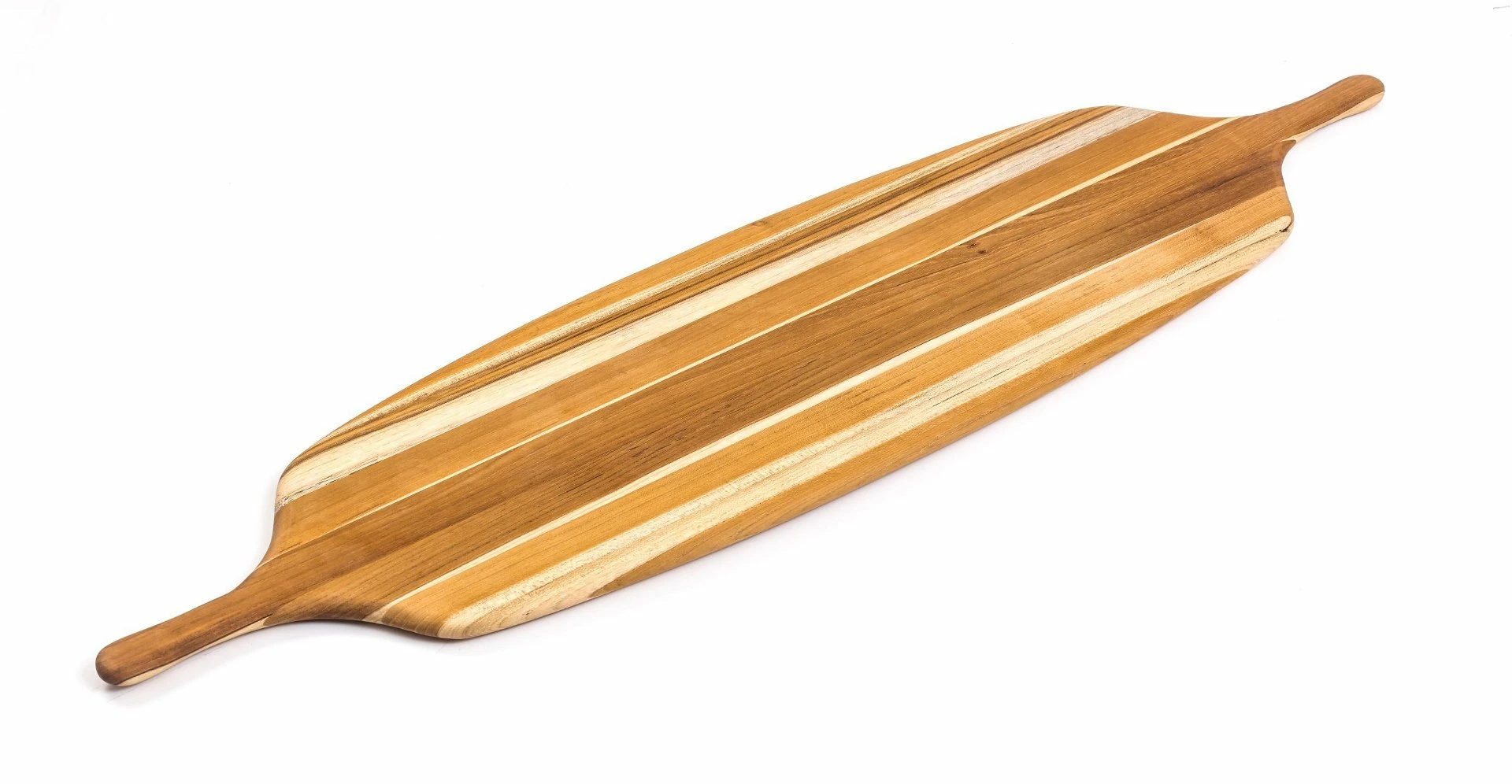 Slice, prep, and serve fruits and vegetables or an elegant charcuterie spread on the TeakHaus Long Paddle Serving Board. This cutting and serving board is crafted from FSC®-certified, stain-resistant teak wood that will never dull your knives. With a long, smooth surface that’ll give you plenty of space to work and a sleek edge grain finish, this board transitions seamlessly from your kitchen counter to your table for a beautiful presentation. Plus, its sturdy yet lightweight construction makes this board perfect for daily use and dinner parties alike and is sure to impress at your next gathering!