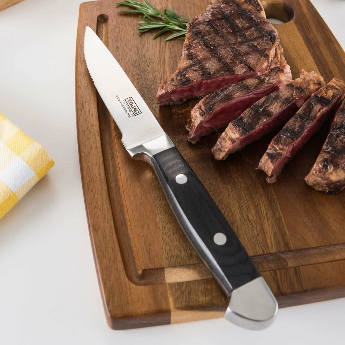 One of the greatest pleasures in life is enjoying a steak dinner, especially with your loved ones celebrating a birthday, a new job or promotion, or any special occasion. But a great steak dinner experience is nothing without quality blades for the best cuts. Before you enjoy steak, consider the Viking 6-Piece Steak Knife Set with Box in Black to help you slice into gorgeous and marbled cuts. Made from high-quality 18/10 German stainless steel, these 5″ corrosion and stain-resistant knives feature a partially serrated edge to help grip the meat and cut through it without tearing or shredding the fibers of the steak. Each knife fashions a dashing black pakkawood handle, making them water and stain-resistant, which are then double-riveted around the full-tang construction with bolster, resulting in extraordinary balance, comfort, and control. Included with this set is a beautiful rubberwood gift box for easy and safe storage. When you are done using these knives, Viking recommends that you wash them by hand. When steak is back on the menu, the Viking 6-Piece Steak Knife Set with Box in Black will ensure your steak dinner is perfect and painless.