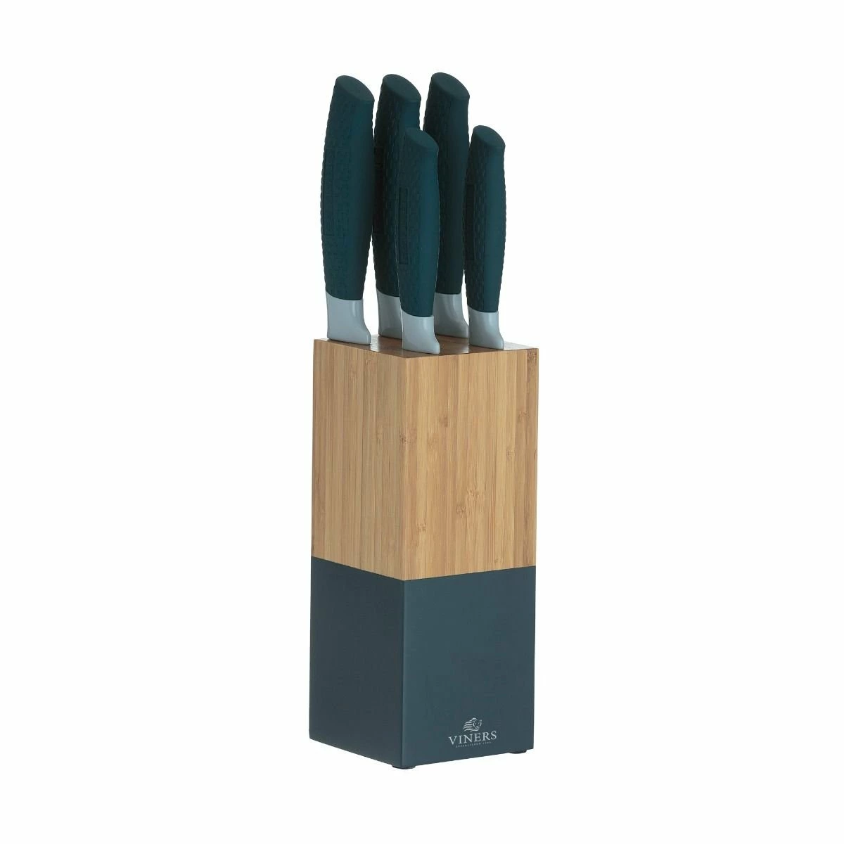 Add a stylishly minimal touch to your kitchen counter with the Viners Horizon 6-Piece Knife Block Set in Indigo. This set includes an 8” chef’s knife, an 8” carving knife, an 8” bread knife, a 5” utility knife, and a 3.5” paring knife, equipping you with a stylish set of essential tools that are perfect for daily prepping and cutting needs. With a square bamboo knife block featuring a pop of indigo for a sleek and sophisticated look, this set comes in a stylish box and makes a great gift for passionate home chefs, newlyweds starting their kitchen toolset, or anyone who enjoys cooking!