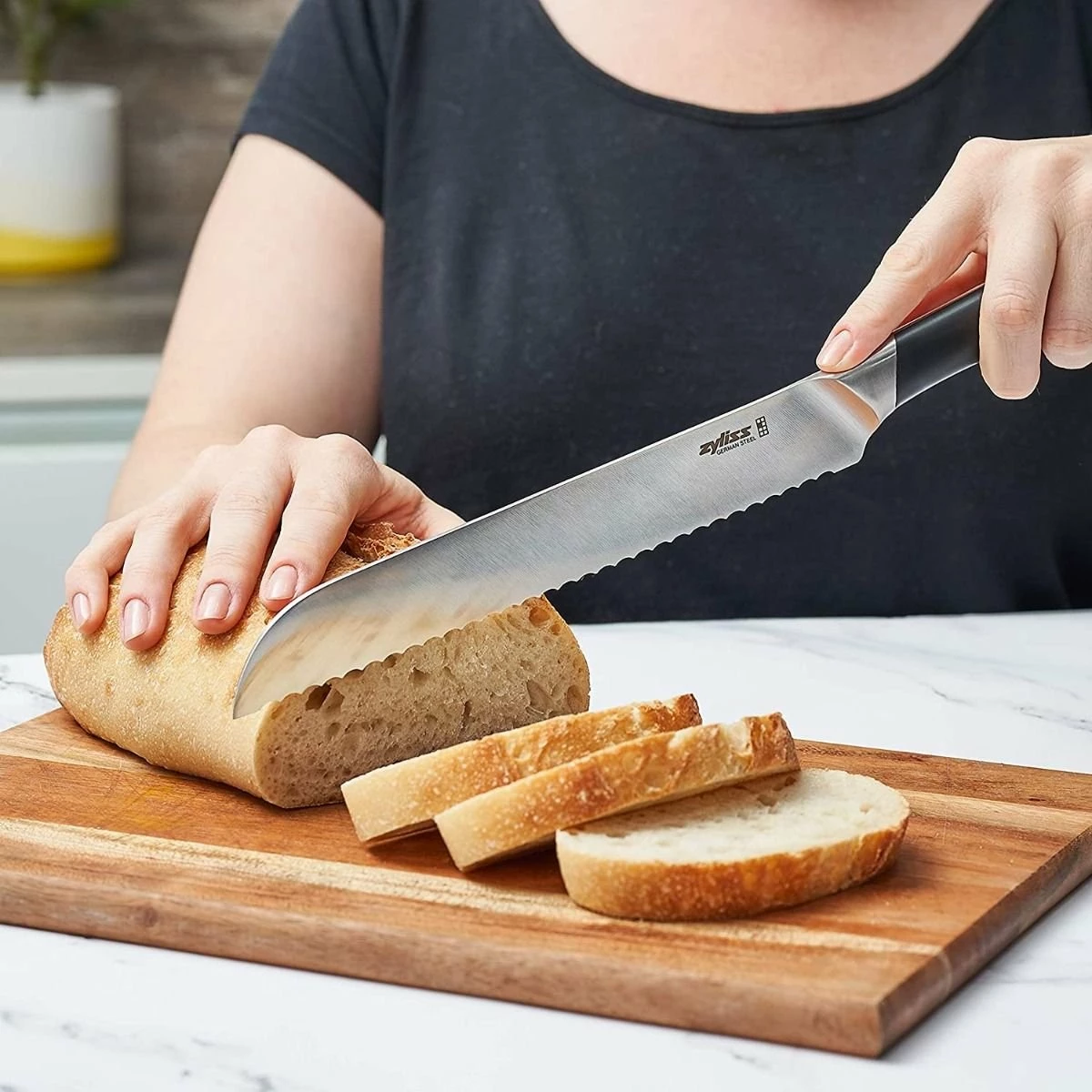 Update your old, dull kitchen knives to a razor-sharp set whose excellence you can count on with the 12-Piece Comfort Pro Knife Block Set from Zyliss. These knives are made of high quality, ice-hardened German steel to be rust-resistant, tarnish-free and durable — claims that are backed by Zyliss’s lifetime warranty. This set includes everything you need to chop, slice, mince, peel and more: one 8″ chef’s knife, one 8″ bread knife, one 5″ mini Santoku, one 4.5″ paring knife, one 5.4″ serrated paring knife and six 4.5″ non-serrated steak knives. It also includes a beautiful acacia wood storage block, an attractive addition to any countertop. With a full-tang for strength and stability, and a sharp 15° taper-ground edge for cutting, you’ll be amazed by each knife’s superior performance. The finger rest at the end of each blade allows you to balance the blade over your ingredients while chopping, and the thumb indent on the handle ensures precision and control to prevent accidents. With a comfortable ergonomic handle, you can easily chop even the most difficult ingredients without excess effort. They can even be cleaned in the dishwasher without losing their edge. Set a standard of excellence in your kitchen and order your Zyliss Comfort Pro 12-Piece Knife Block Set today.